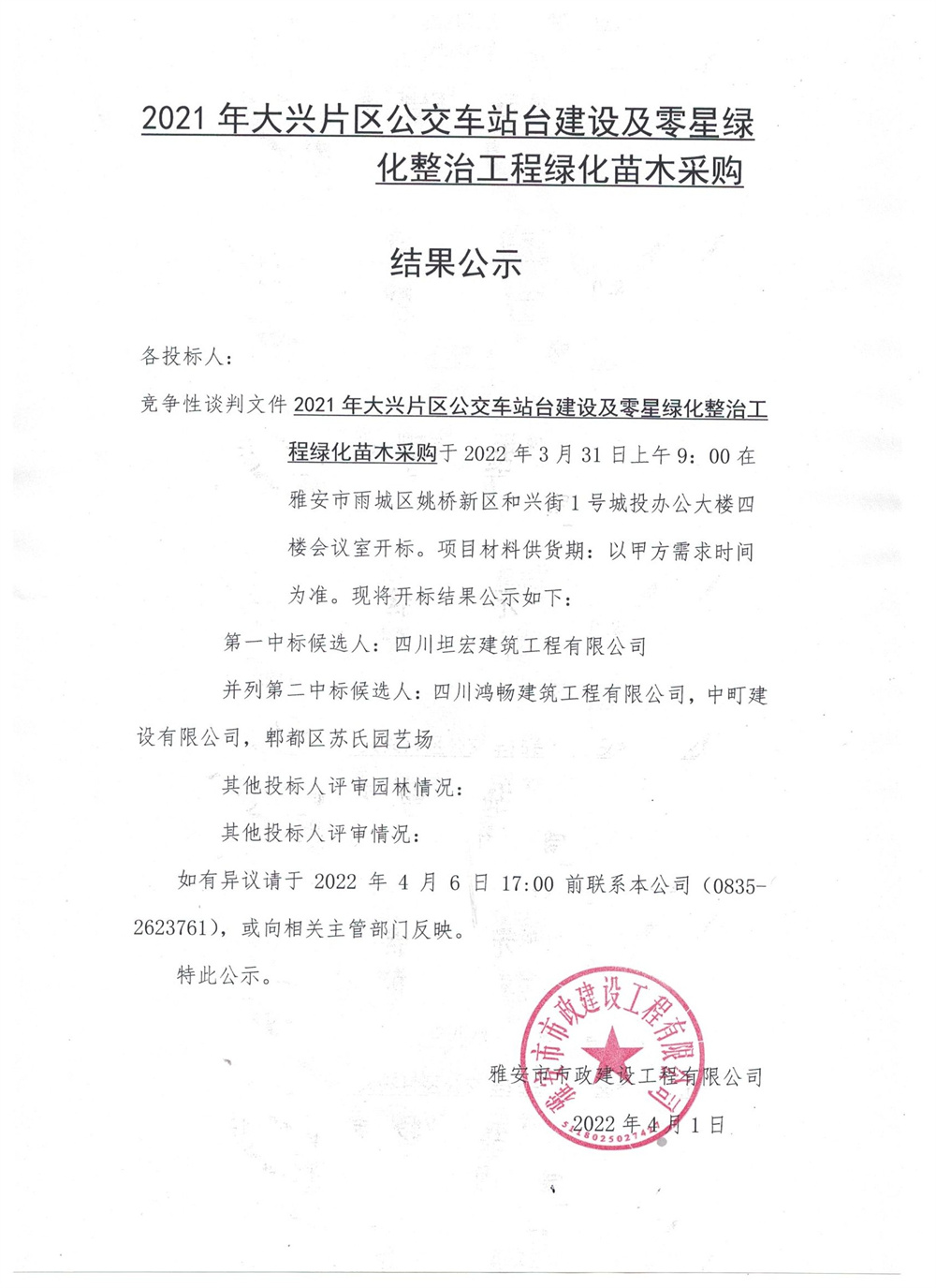 2021年大興片區(qū)公交站臺建設及零星綠地整治工程綠化苗木采購結果公示