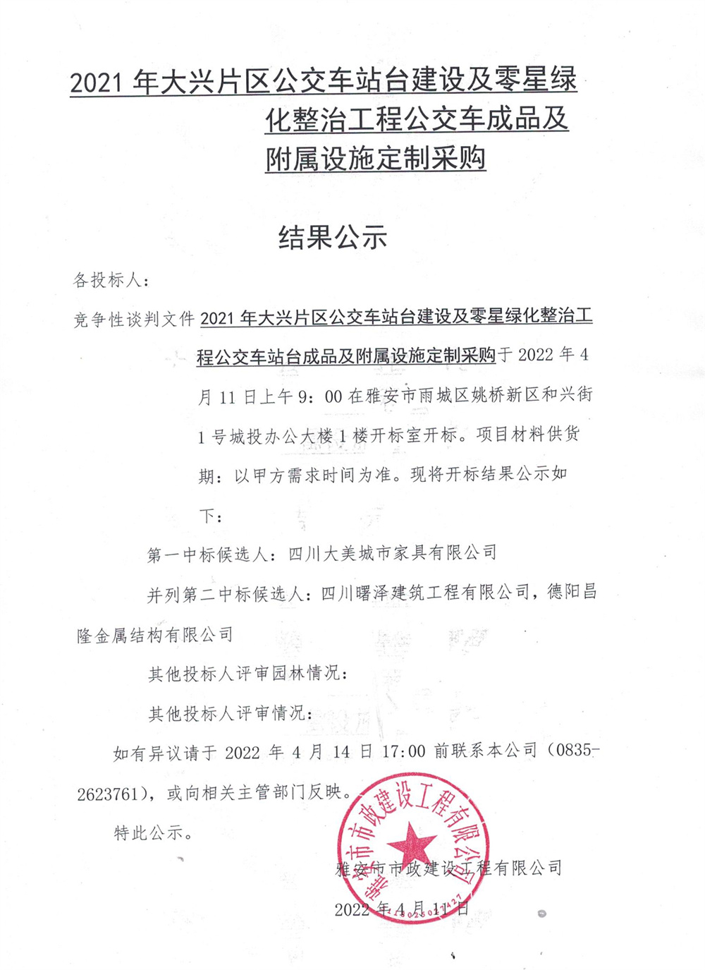 2021年大興片區(qū)公交站臺建設及零星綠地整治工程公交站臺成品及附屬設施定制采購結果公示