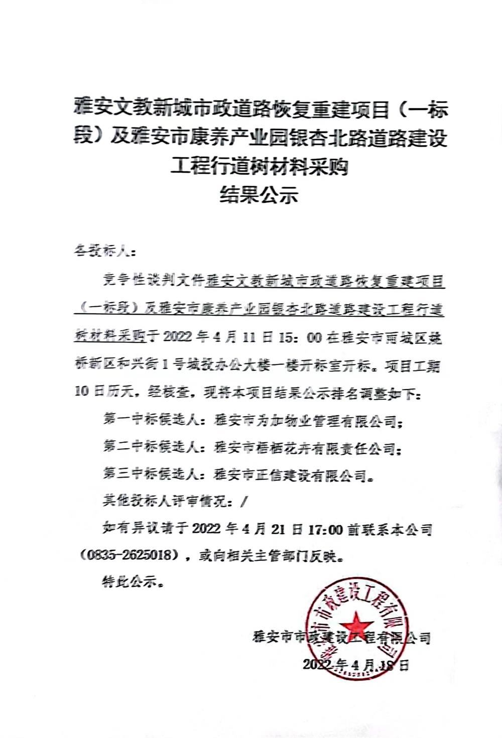 雅安文教新城市政道路恢復(fù)重建項(xiàng)目(一標(biāo)段)及雅安市康養(yǎng)產(chǎn)業(yè)園銀杏北路道路建設(shè)工程行道樹材料采購(gòu)結(jié)果公示