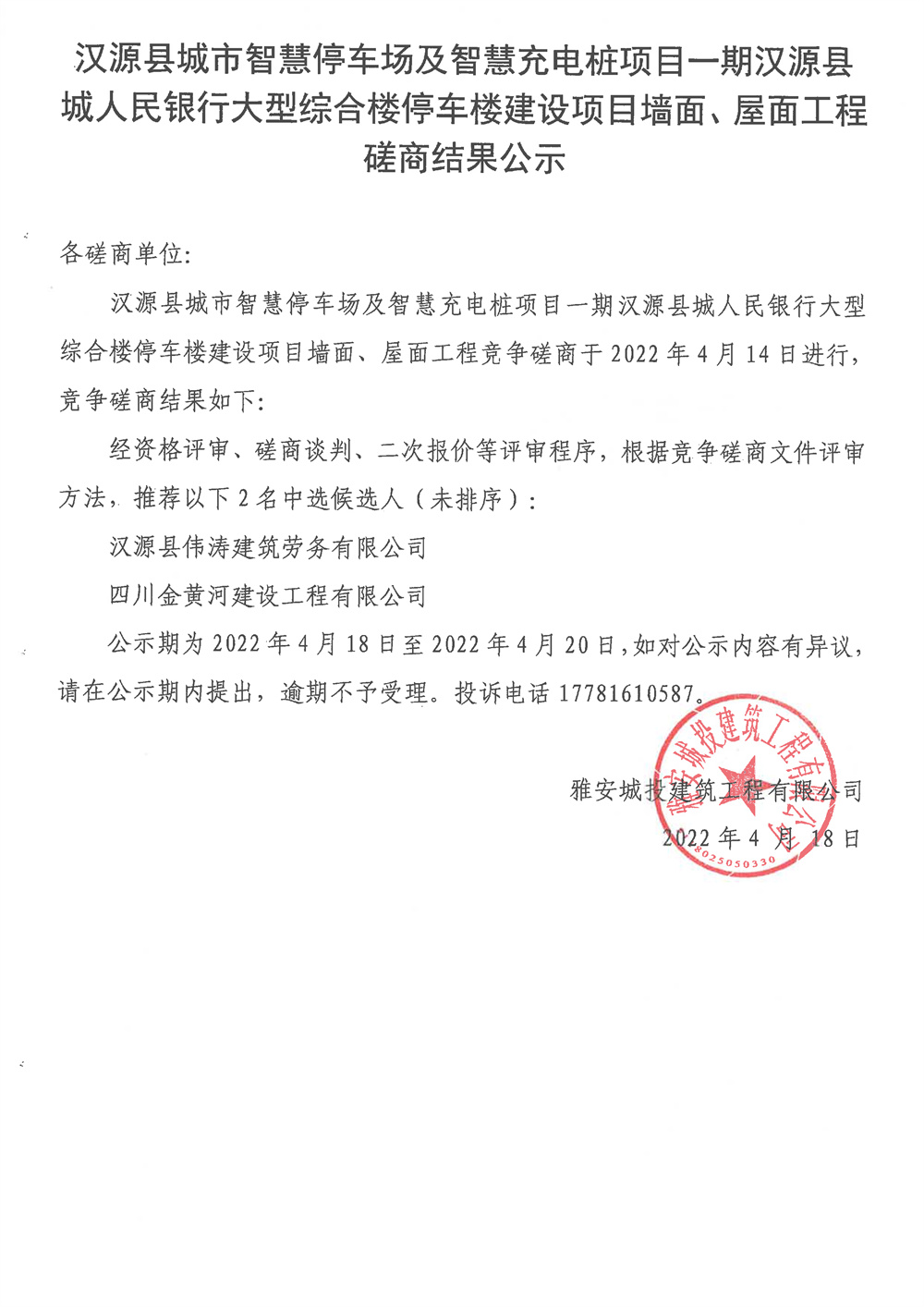 城投建工漢源縣城市智慧停車場及智慧充電樁項目一期漢源縣城人民銀行大型綜合樓停車樓建設項目墻面、屋面工程競爭磋商結(jié)果公示