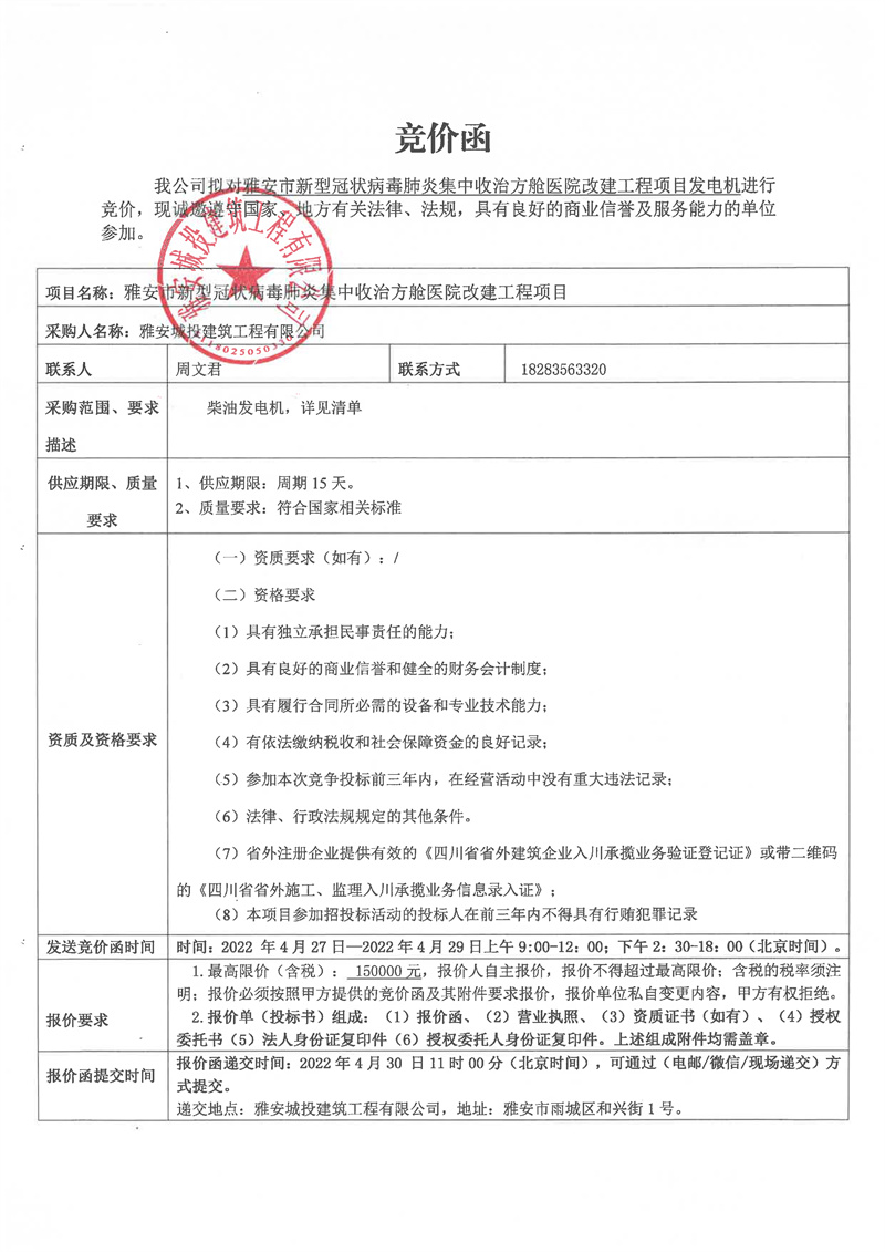 雅安市新型冠狀病毒肺炎集中收治方艙醫(yī)院改建工程項(xiàng)目發(fā)電機(jī)競(jìng)價(jià)函