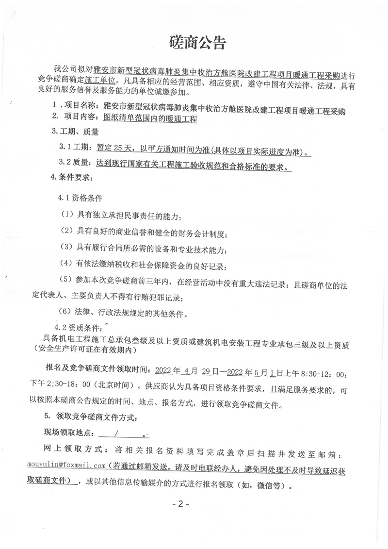 雅安市新型冠狀病毒肺炎集中收治方艙醫(yī)院改建工程項(xiàng)目暖通工程談判磋商公告
