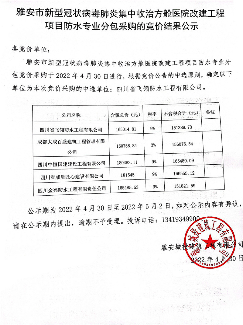 雅安市新型冠狀病毒肺炎集中收治方艙醫(yī)院改建工程項目防水專業(yè)分包采購的競價結果公示