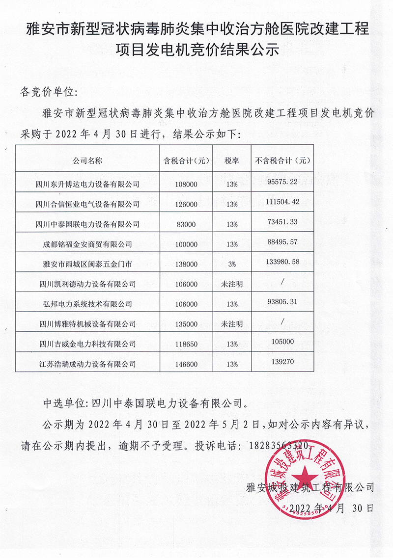 雅安市新型冠狀病毒肺炎集中收治方艙醫(yī)院改建工程項目發(fā)電機競價結(jié)果公示
