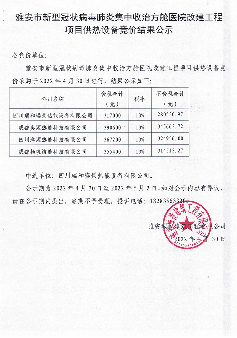 雅安市新型冠狀病毒肺炎集中收治方艙醫(yī)院改建工程項(xiàng)目供熱設(shè)備競價(jià)結(jié)果公示
