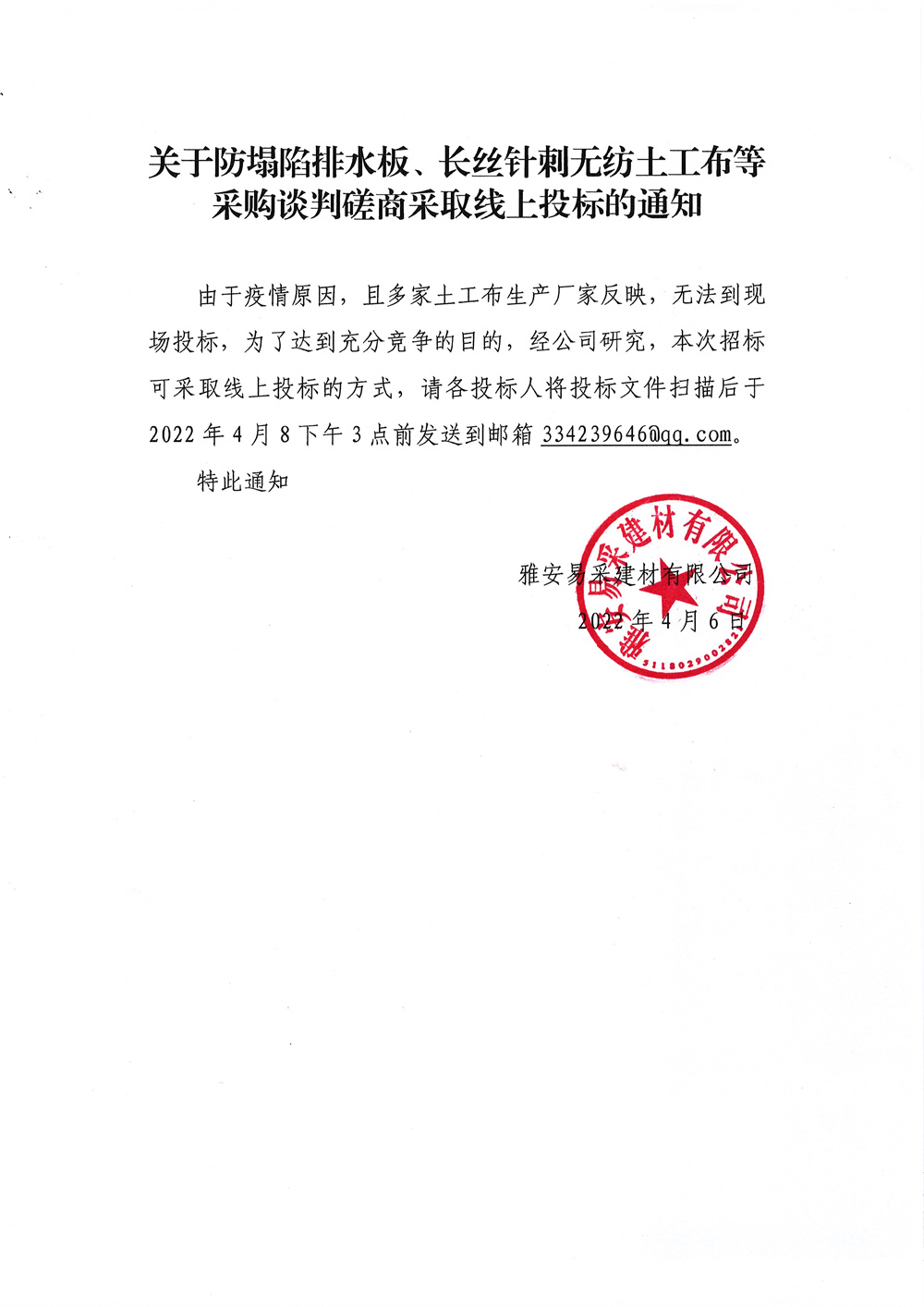 雅安易采建材有限公司防塌陷排水板、長(zhǎng)絲針刺無(wú)紡?fù)凉げ嫉炔少?gòu)談判磋商采取線上投標(biāo)的通知