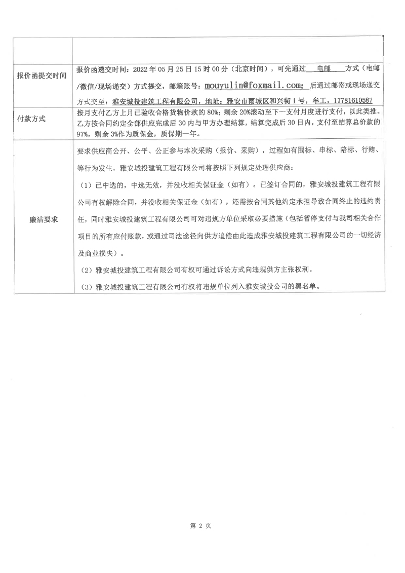 雅安市建安公司棚戶區(qū)改造安置房項(xiàng)目配管、鋼管等水電材料競價(jià)函