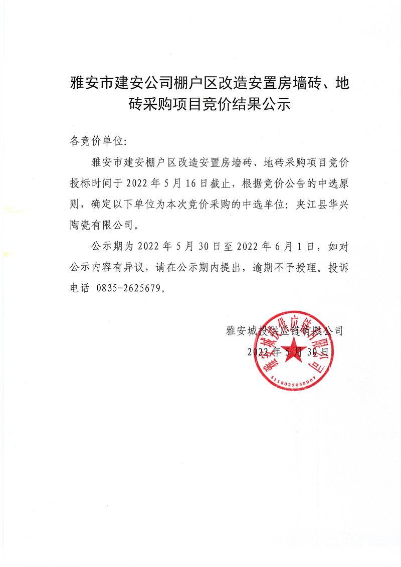 雅安市建安公司棚戶區(qū)改造安置房墻磚、地磚采購競價項目競價結果公示