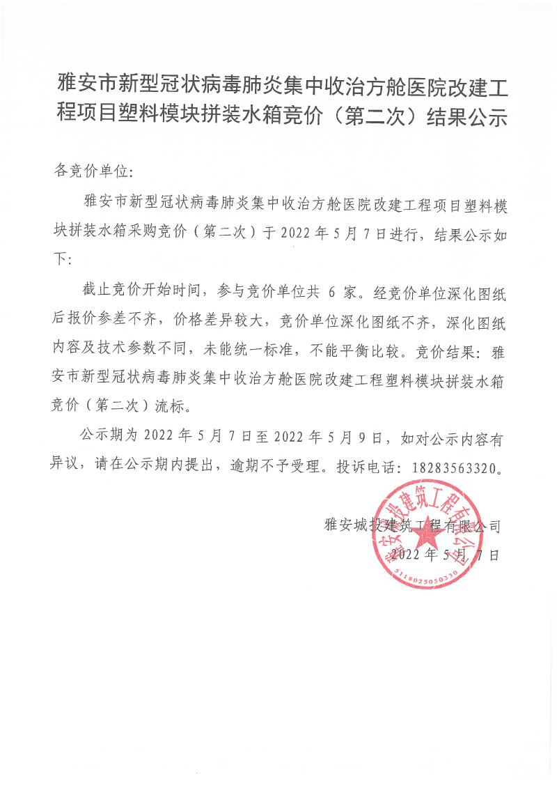 雅安市新型冠狀病毒肺炎集中收治方艙醫(yī)院改建工程項目塑料模塊拼裝水箱競價(第二次)結(jié)果公示