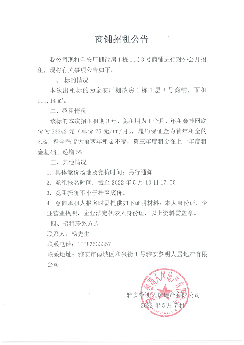 金安廠棚改房1棟1層3號(hào)商鋪招租公告