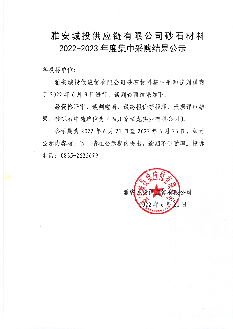 雅安城投供應鏈有限公司砂石材料2022-2023年度集中采購結(jié)果公示