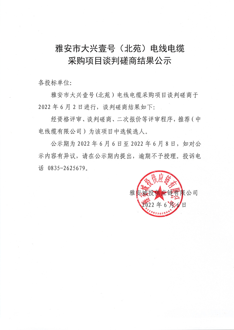 雅安城投供應(yīng)鏈有限公司大興壹號(北苑)項(xiàng)目電線電纜談判磋商結(jié)果公示