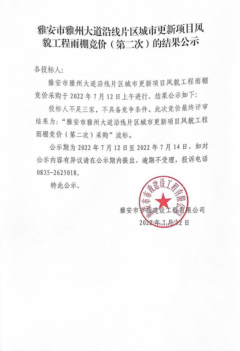 雅安市雅州大道沿線片區(qū)城市更新項(xiàng)目風(fēng)貌工程雨棚競價(jià)(第二次)的結(jié)果公示