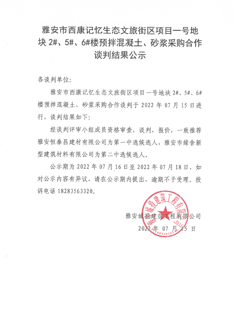 雅安市西康記憶生態(tài)文旅街區(qū)項目一號地塊2#、5#、6#樓預拌混凝土、砂漿采購合作談判結果公示