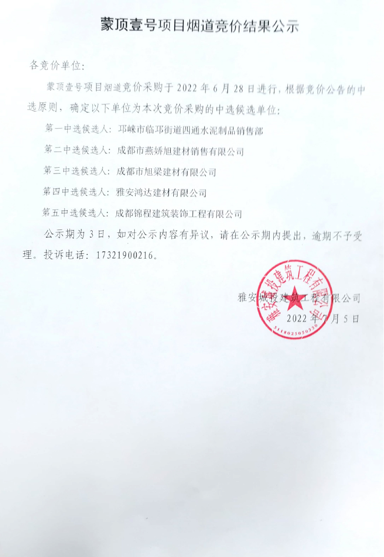 蒙頂壹號項目煙道采購競價結(jié)果公示