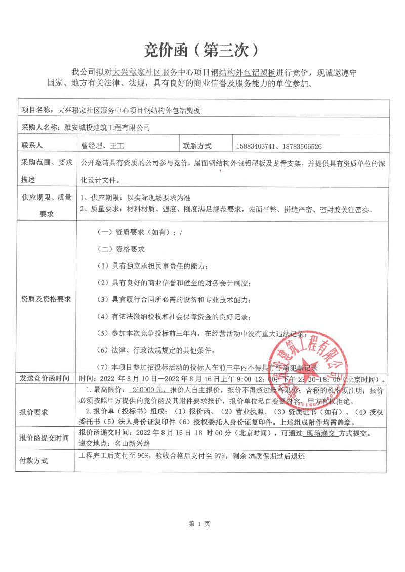 大興穆家社區(qū)服務(wù)中心項(xiàng)目鋼結(jié)構(gòu)外包鋁塑板競(jìng)價(jià)公告(第三次)