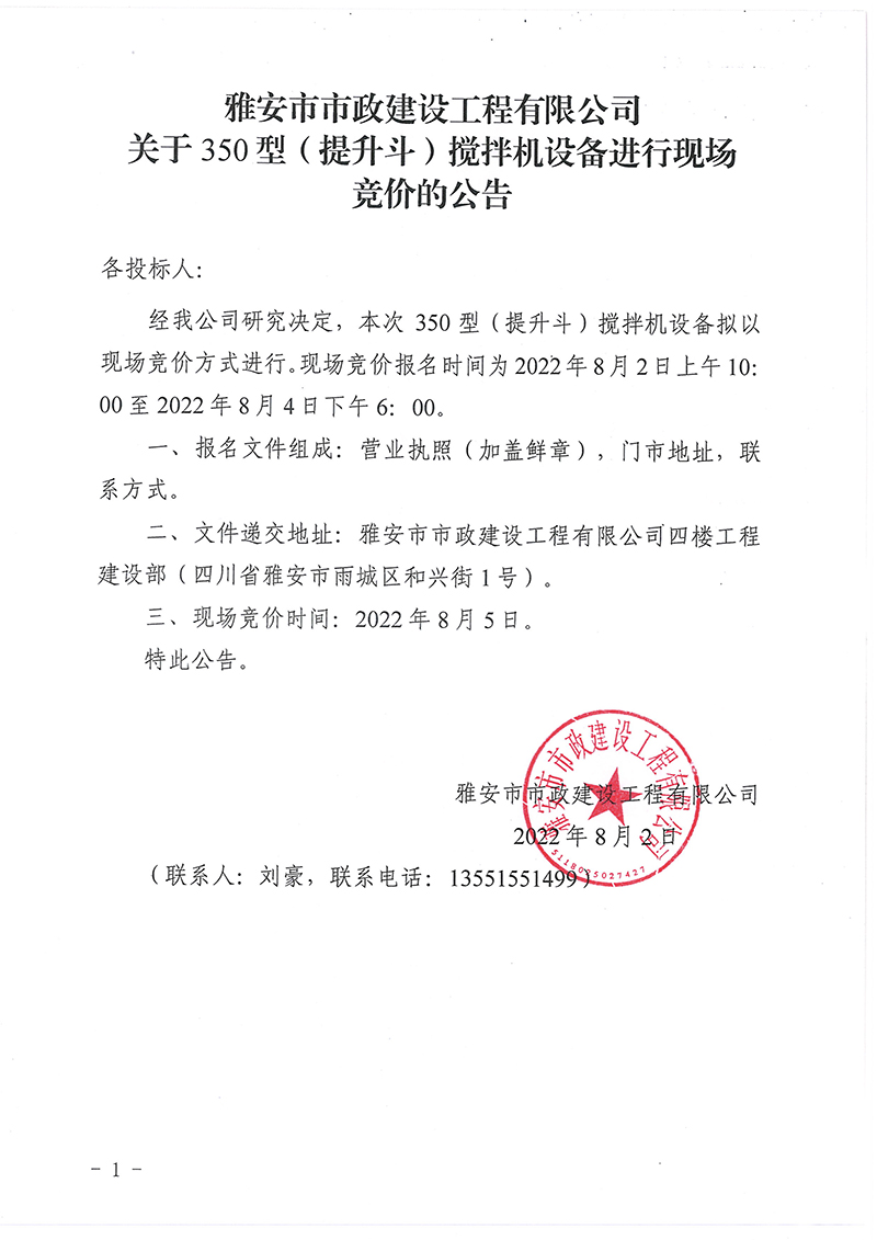 關于350型(提升斗)攪拌機設備進行現場競價的公告