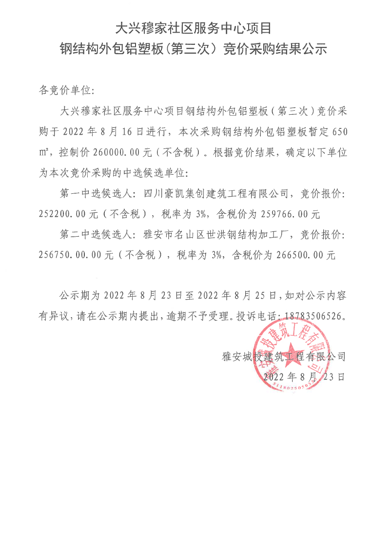 大興穆家社區(qū)服務(wù)中心項(xiàng)目鋼結(jié)構(gòu)外包鋁塑板(第三次)競(jìng)價(jià)采購結(jié)果公示