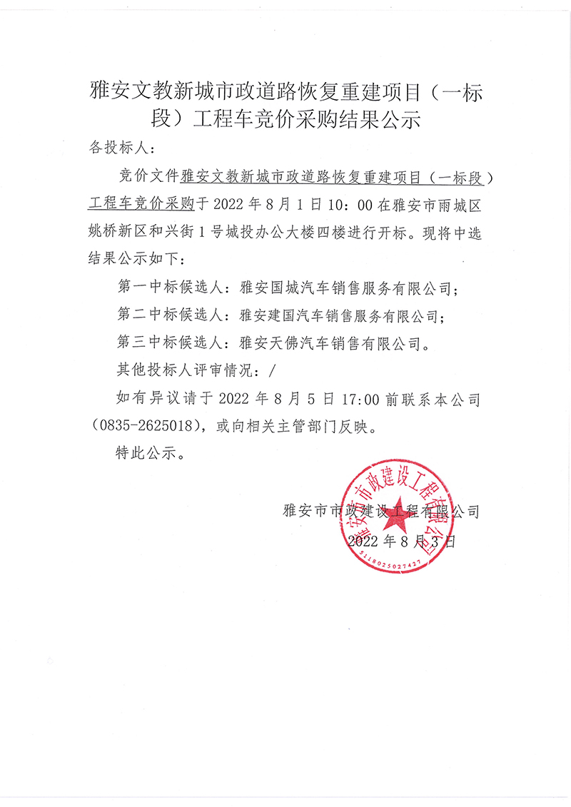 雅安文教新城市政道路恢復重建項目(一標段)工程車競價采購結果公示