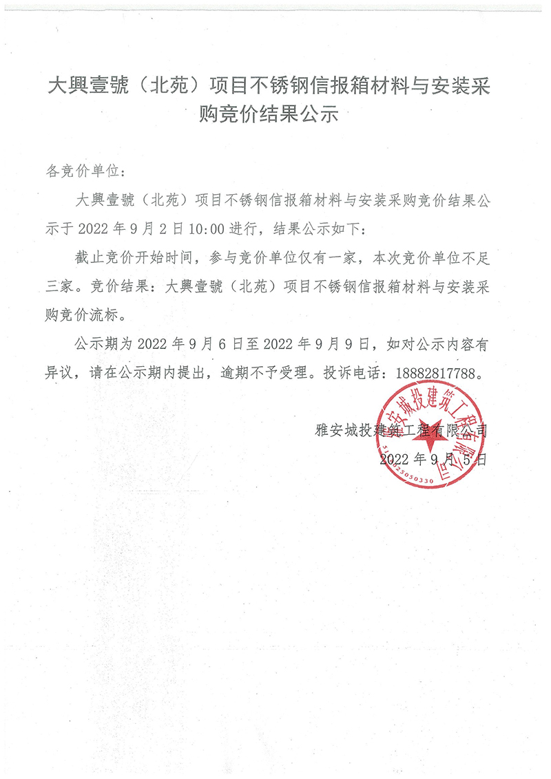 大興壹號(hào)(北苑)項(xiàng)目不銹鋼信報(bào)箱材料與安裝采購競價(jià)結(jié)果公示