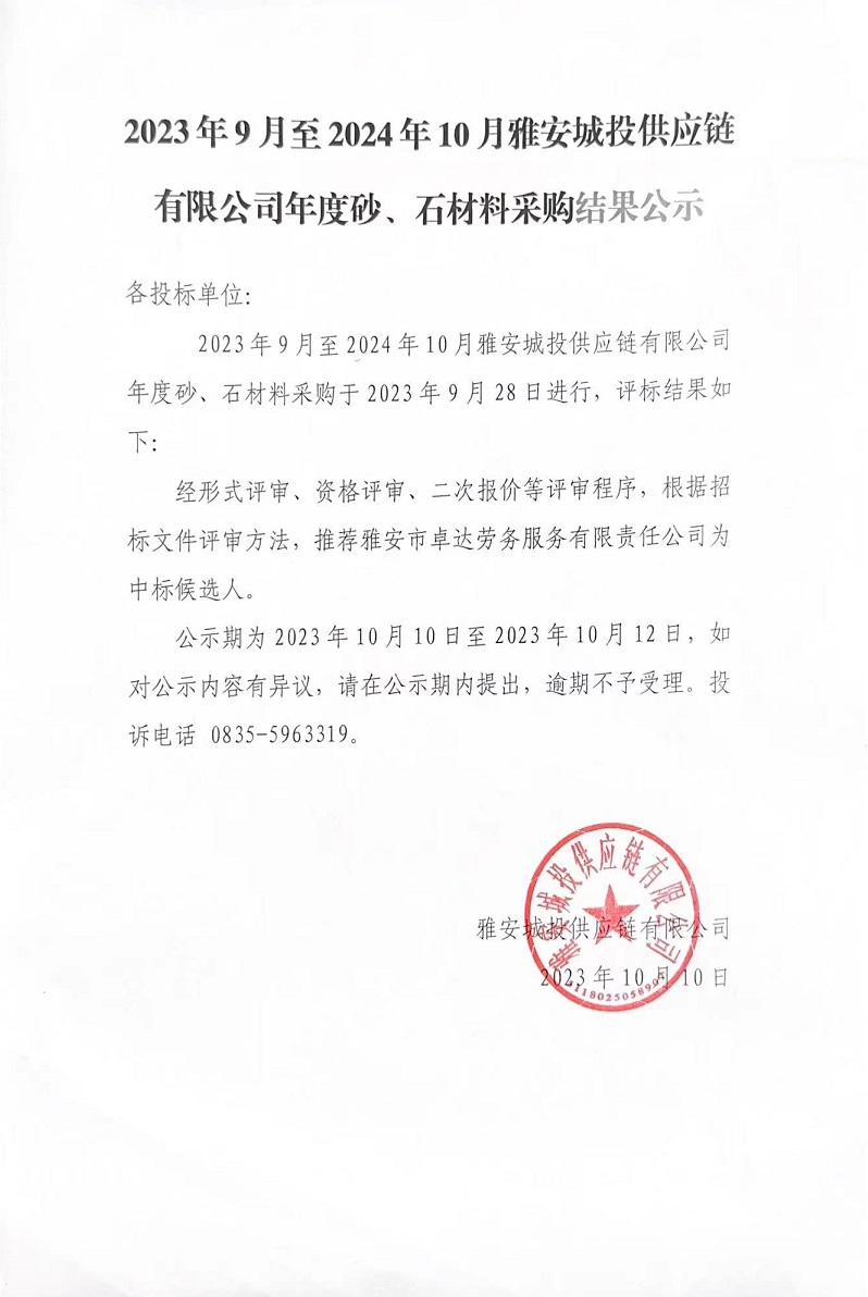 2023年9月至2024年10月雅安城投供應(yīng)鏈有限公司年度砂、石材料采購(gòu)結(jié)果公示