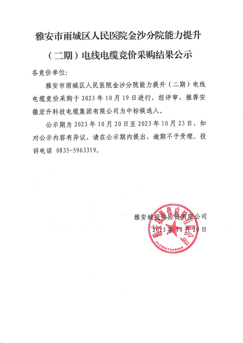 雅安市雨城區(qū)人民醫(yī)院金沙分院能力提升(二期)電線電纜競價(jià)采購結(jié)果公示