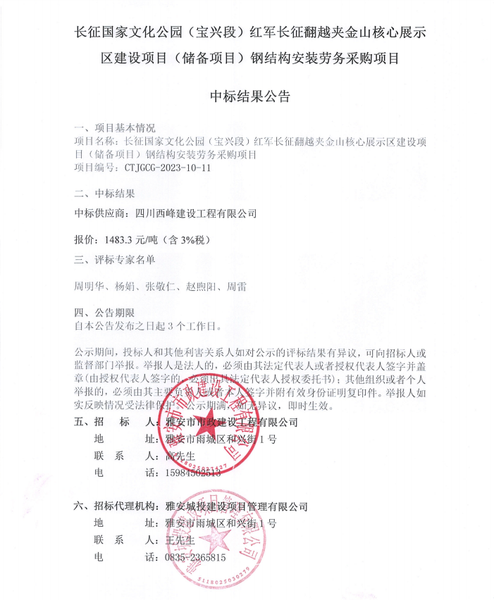 長征國家文化公園(寶興段)紅軍長征翻越夾金山核心展示區(qū)建設(shè)項(xiàng)目(儲(chǔ)備項(xiàng)目)鋼結(jié)構(gòu)安裝勞務(wù)采購項(xiàng)目中標(biāo)結(jié)果公告