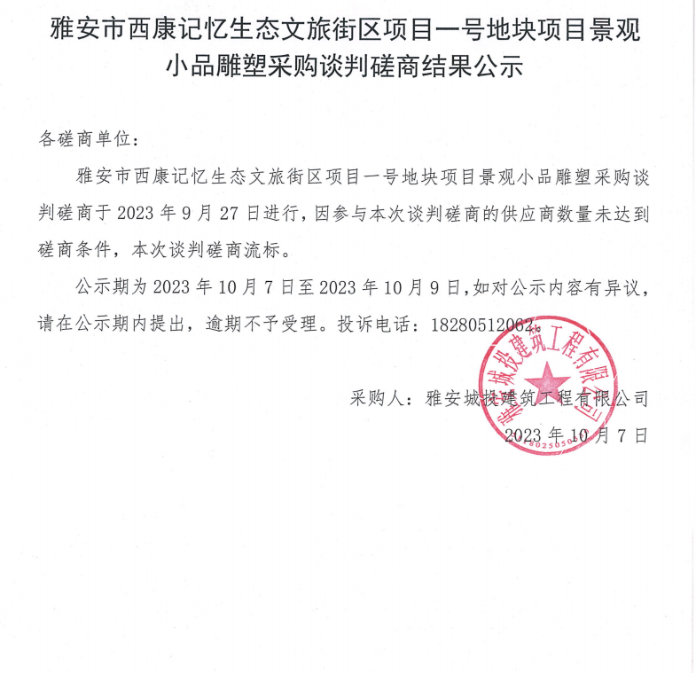 雅安市西康記憶生態(tài)文旅街區(qū)項(xiàng)目一號(hào)地塊項(xiàng)目景觀小品雕塑采購(gòu)談判磋商結(jié)果公示
