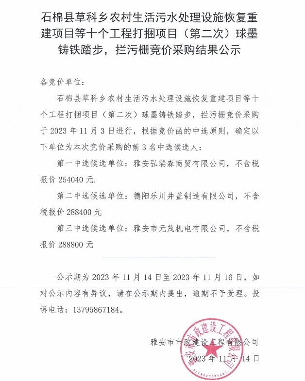 石棉縣草科鄉(xiāng)農(nóng)村生活污水處理設施恢復重建項目等十個工程打捆項目(第二次)球墨鑄鐵踏步,攔污柵競價采購結(jié)果公示