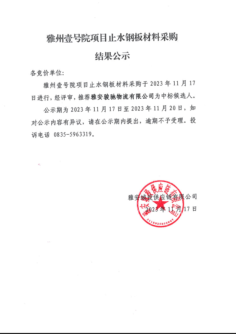 雅州壹號(hào)院項(xiàng)目止水鋼板材料采購(gòu)結(jié)果公示