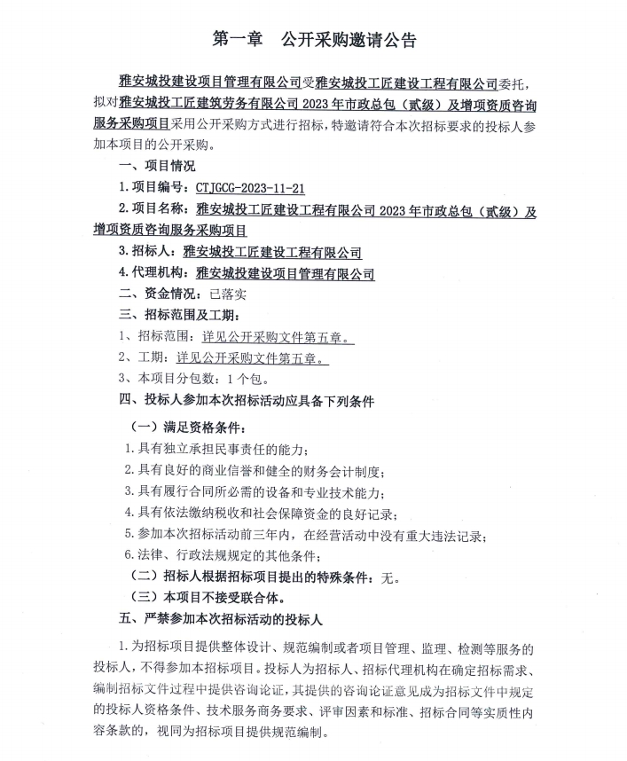 雅安城投工匠建設(shè)工程有限公司2023年市政總包(貳級(jí))及增項(xiàng)資質(zhì)咨詢服務(wù)采購(gòu)項(xiàng)目公開(kāi)采購(gòu)邀請(qǐng)公告