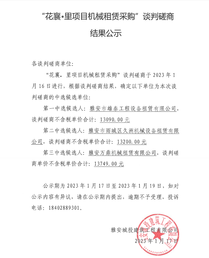 花襄·里項目機械租賃采購談判磋商結果公示