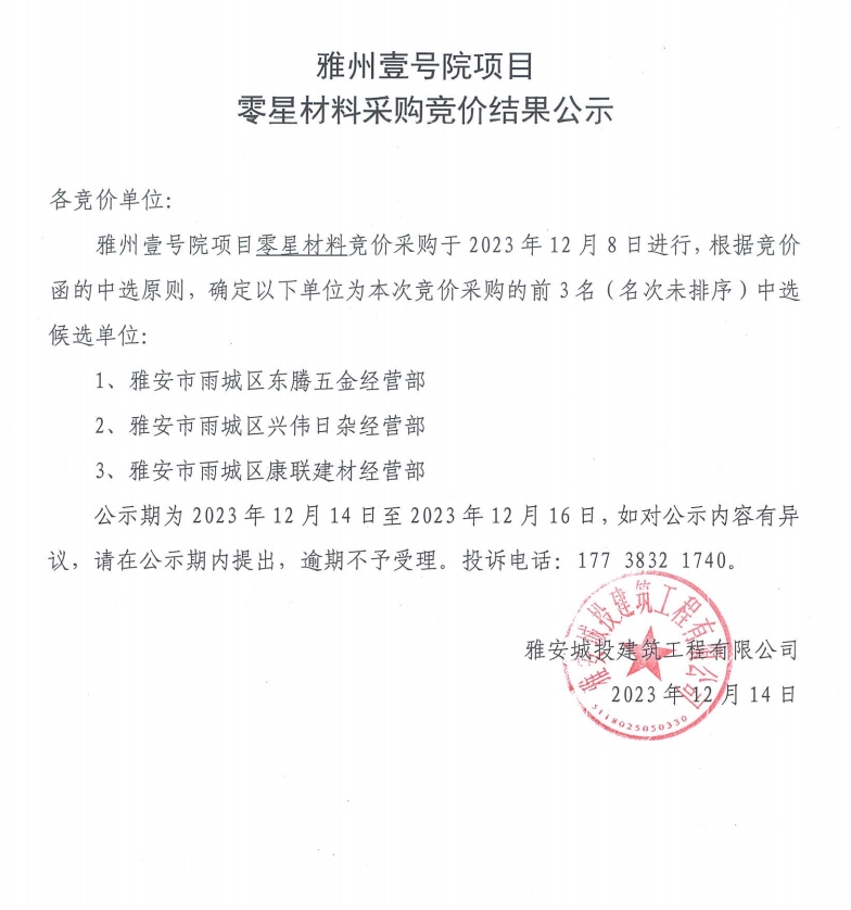 雅州壹號院項(xiàng)目零星材料采購競價結(jié)果公示