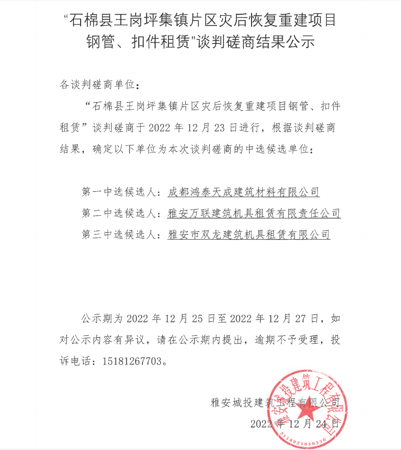 “石棉縣王崗坪集鎮(zhèn)片區(qū)災(zāi)后恢復(fù)重建項目鋼管、扣件租賃”談判磋商結(jié)果公示