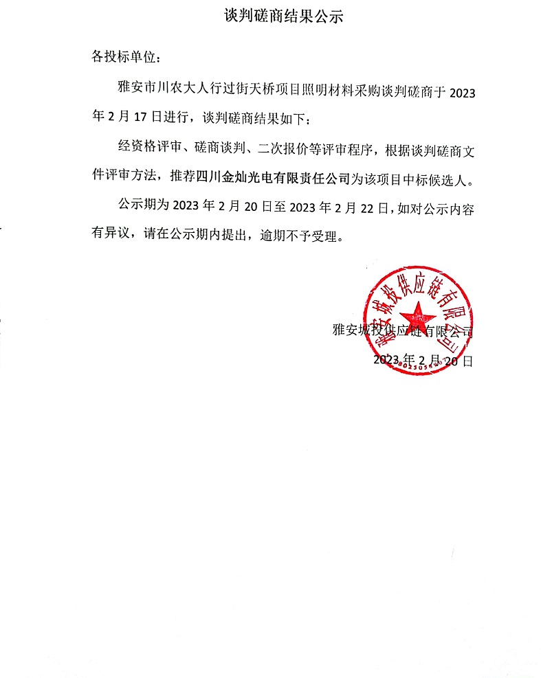 雅安市川農(nóng)大人行過街天橋項目照明材料采購談判磋商結(jié)果公示