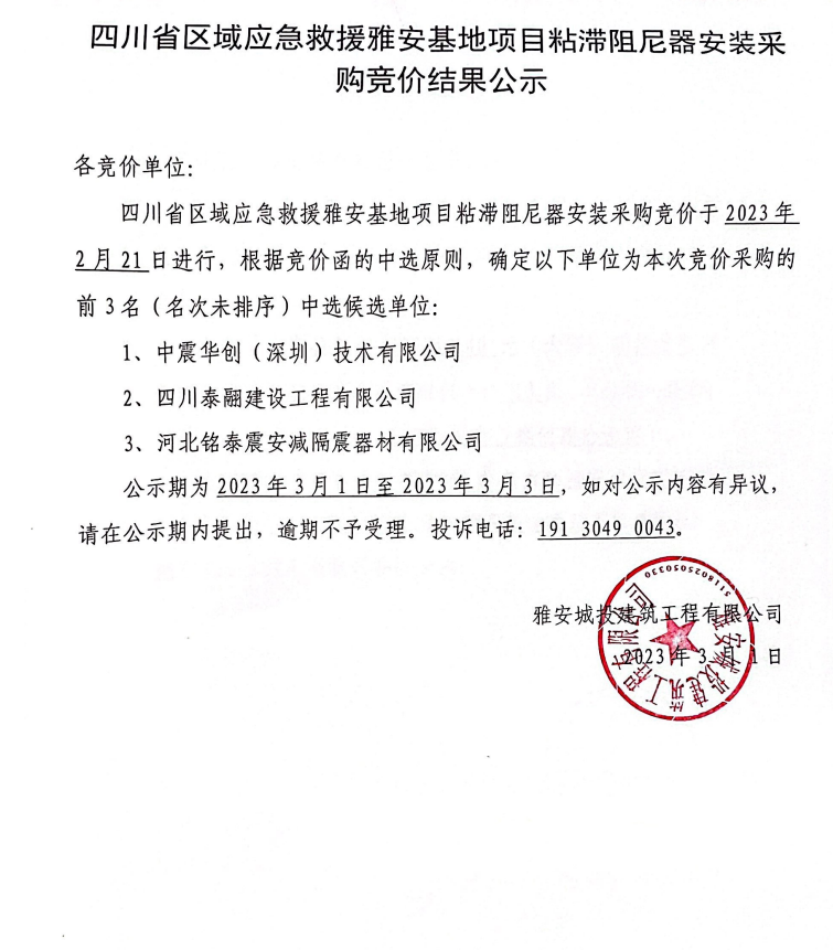 四川省區(qū)域應(yīng)急救援雅安基地項(xiàng)目粘滯阻尼器安裝采購競(jìng)價(jià)結(jié)果公示