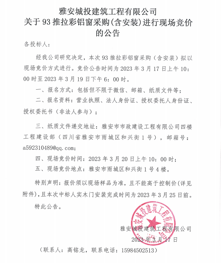 雅安城投建筑工程有限公司關(guān)于93推拉彩鋁窗采購(含安裝)進(jìn)行現(xiàn)場競價(jià)的公告