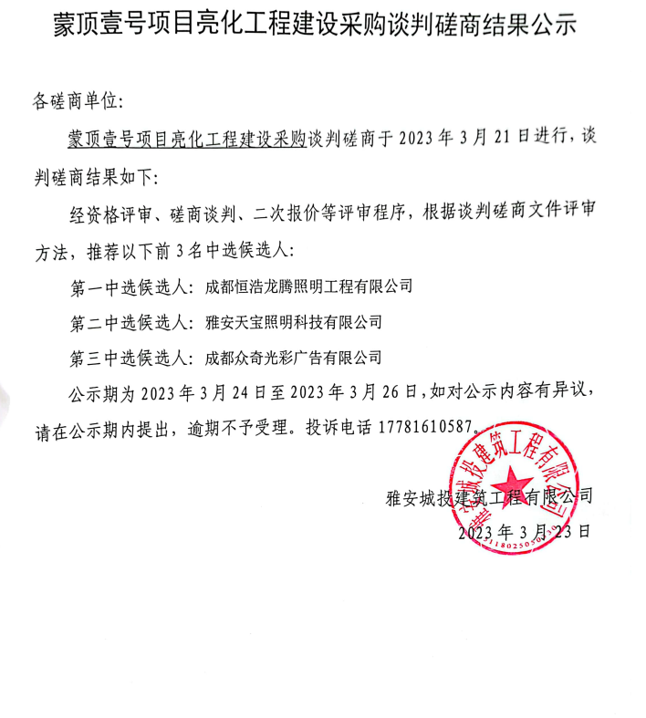 蒙頂壹號項目亮化工程建設采購談判磋商結果公示