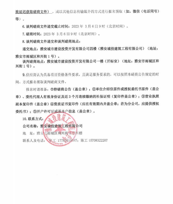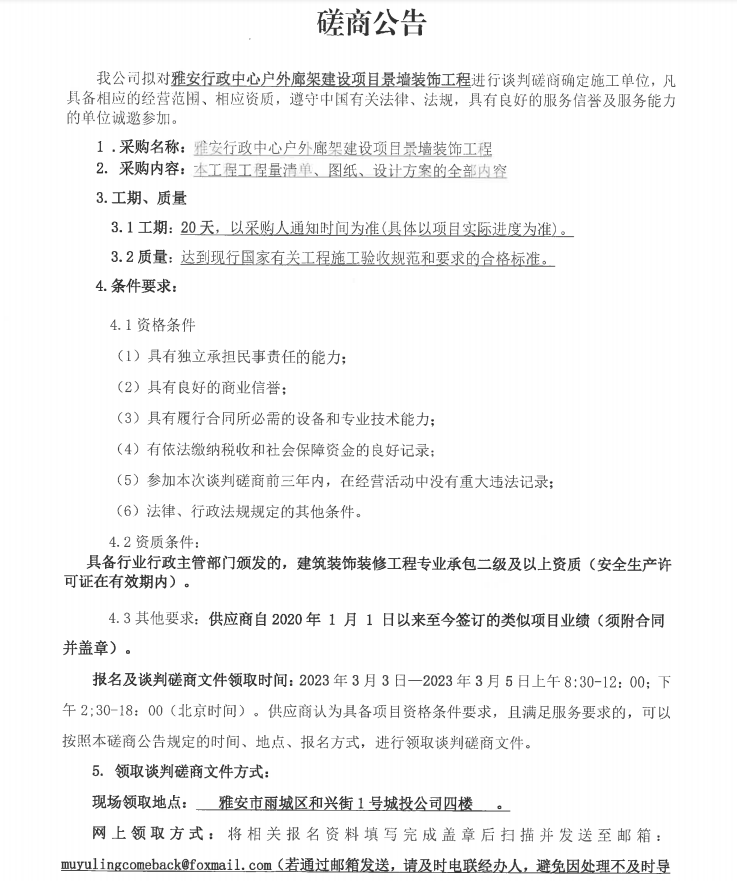 雅安行政中心戶外廊架建設(shè)項目景墻裝飾工程談判磋商公告