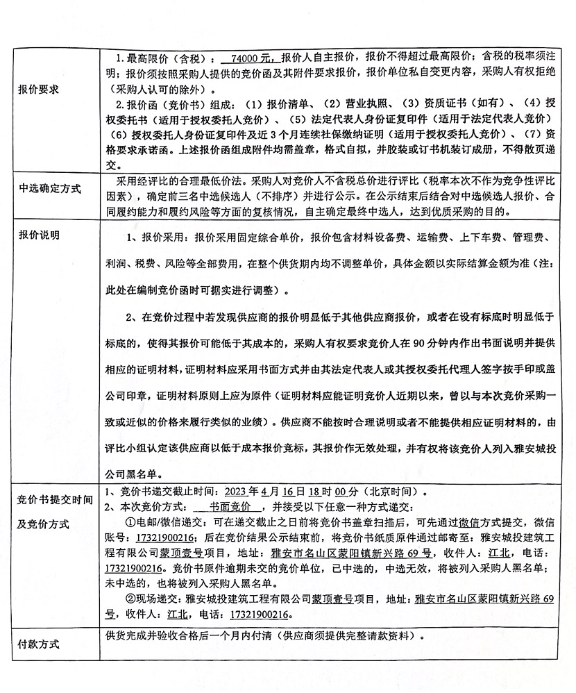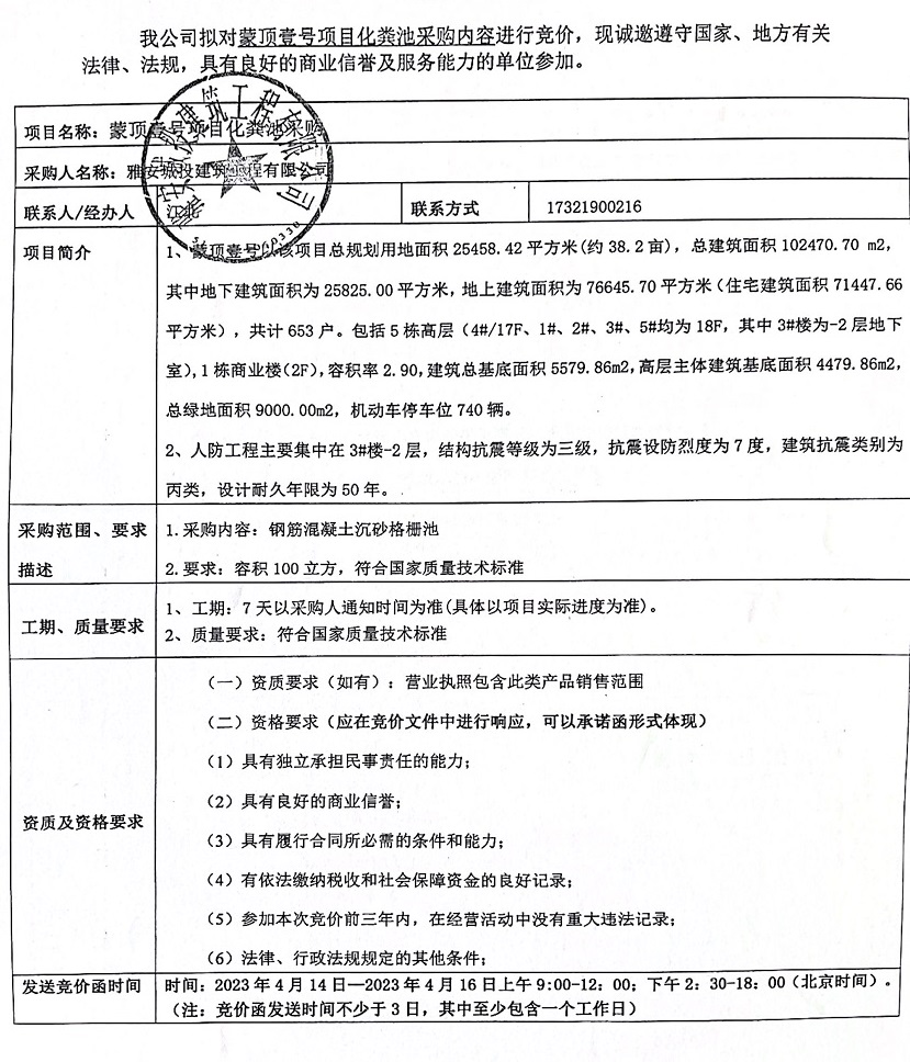 蒙頂壹號(hào)項(xiàng)目化糞池競(jìng)價(jià)公告