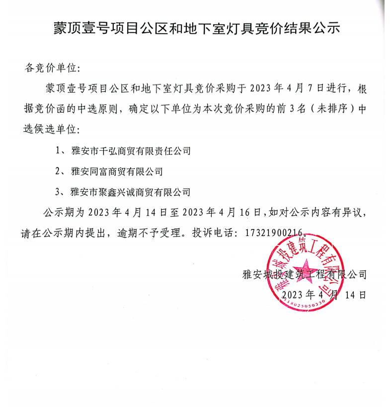 蒙頂壹號(hào)項(xiàng)目公區(qū)和地下室燈具競價(jià)結(jié)果公示