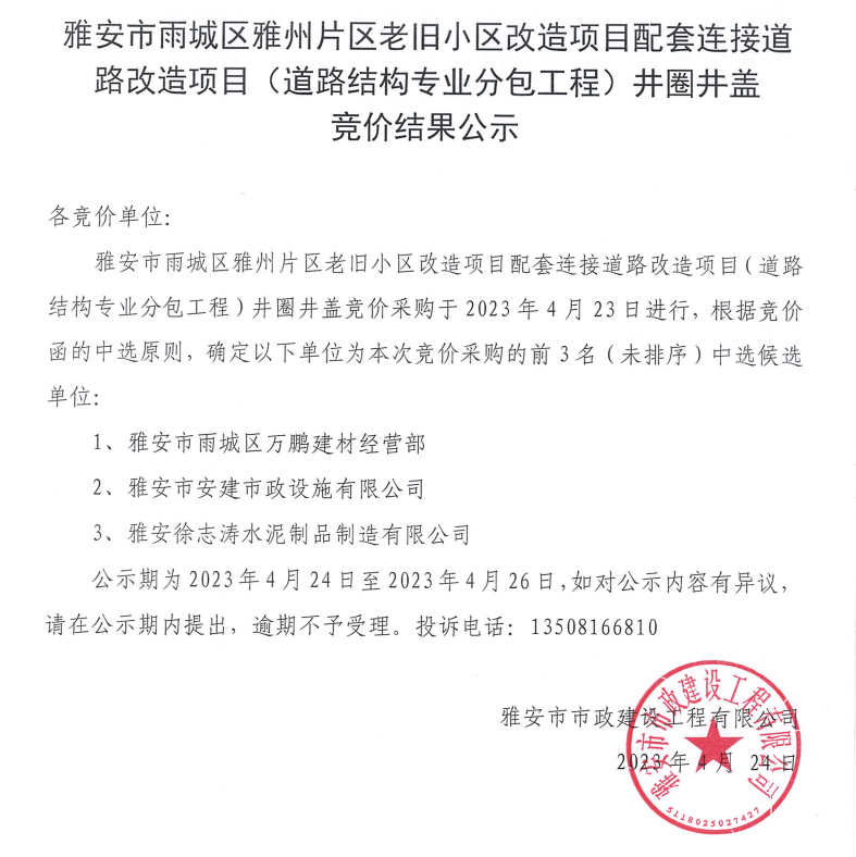 雅安市雨城區(qū)雅州片區(qū)老舊小區(qū)改造項(xiàng)目配套連接道路改造項(xiàng)目(道路結(jié)構(gòu)專業(yè)分包工程)井圈井蓋競價(jià)結(jié)果公示