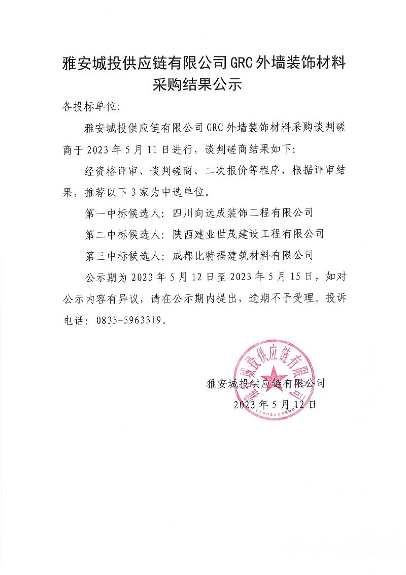 雅安城投供應(yīng)鏈有限公司GRC外墻裝飾材料采購(gòu)結(jié)果公示