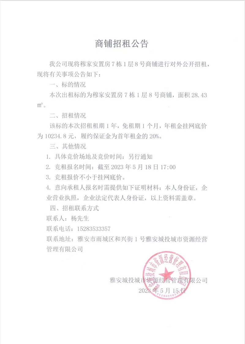 穆家安置房7棟1層8號(hào)商鋪招租公告