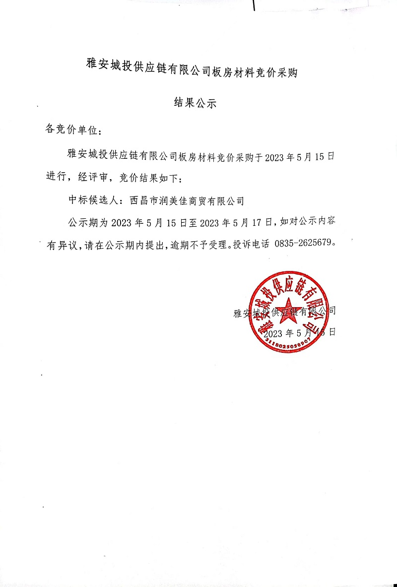 雅安城投供應(yīng)鏈有限公司板房材料競價(jià)采購結(jié)果公示
