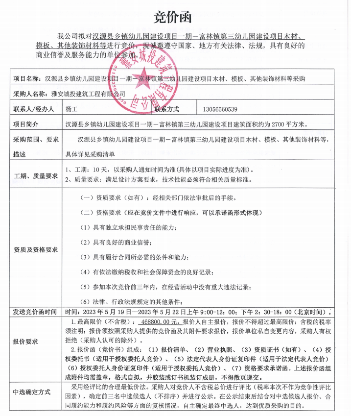 漢源縣鄉(xiāng)鎮(zhèn)幼兒園建設(shè)項(xiàng)目一期一富林鎮(zhèn)第三幼兒園建設(shè)項(xiàng)目木材、模板、其他裝飾材料等采購(gòu)競(jìng)價(jià)公告