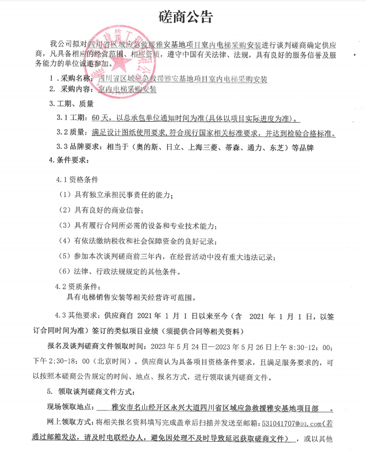 四川省區(qū)域應急救援雅安基地項目室內(nèi)電梯采購安裝談判磋商公告