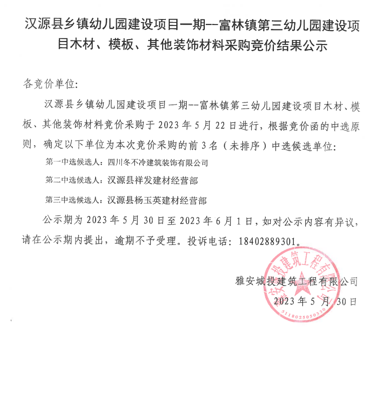 漢源縣鄉(xiāng)鎮(zhèn)幼兒園建設(shè)項(xiàng)目一期--富林鎮(zhèn)第三幼兒園建設(shè)項(xiàng)目木材、模板、其他裝飾材料采購競價(jià)結(jié)果公示