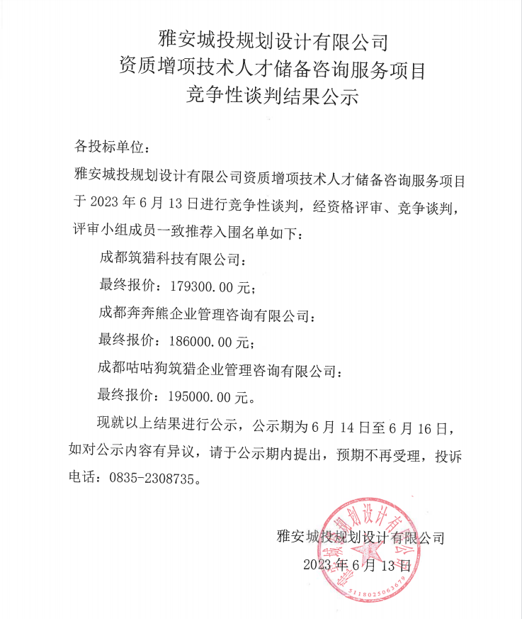 雅安城投規(guī)劃設計有限公司資質增項技術人才儲備咨詢服務項目競爭性談判結果公示