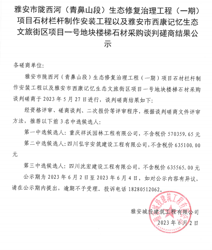 雅安市隴西河(青鼻山段)生態(tài)修復(fù)治理工程(一期)項(xiàng)目石材欄桿制作安裝工程以及雅安市西康記憶生態(tài)文旅街區(qū)項(xiàng)目一號(hào)地塊樓梯石材采購(gòu)談判磋商結(jié)果公示